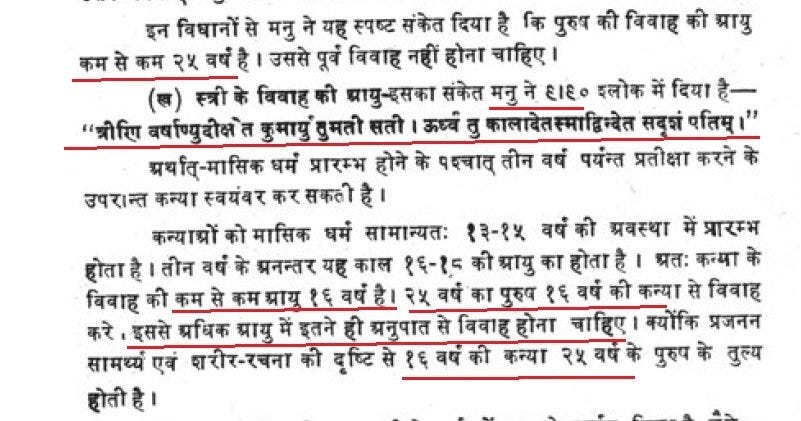 Sushruta Samhita through a Medical approach as per readiness of human body and Manusmriti from the perspective of Dharma and Society, arrived at the same conculsion that Minimum Age for marriage of Male ≥25 yr and for Female atleast ≥16 yr. Please again atleast sixteen means it can be in 20s as well. It straight away rules out the concept of child marriage in Males or Females both as per ancient medical authority and dharmic scriptures.