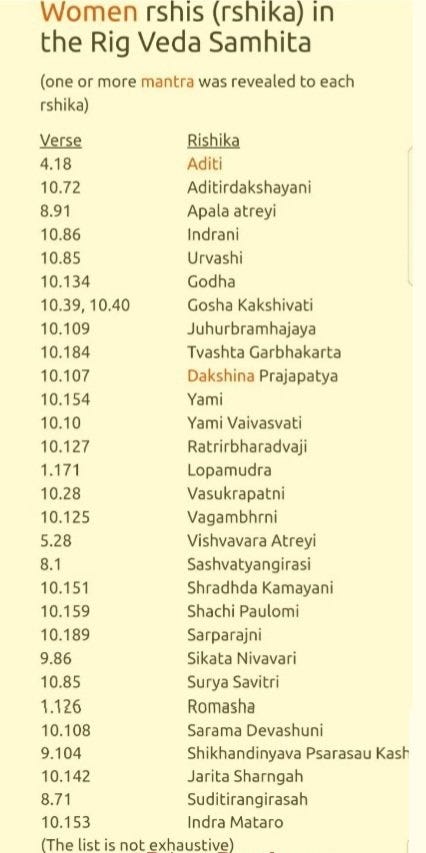 Now Let’s understand why Less women will read Vedas before Marriage. Please note that Vedanga Course is of min six years , followed by Each Veda around nine years. While men would go on to be dwivedi/trivedi or even chaturvedi thereby continuing their brahmacharya ashram till 40s, however if women would do so, they could loose their time of 20s and 30s with most fertile magic of bringing new life to world in 40s. However some women would do so, they were called Brahmavadinis, compared to Sadyodvahas who would continue marriage and be a part of rituals and Vedic studies side by side. Hindu Ladies will be proud to know that concept of Rishikas (Female Seers), Upadhyayinis ( Female Teachers) were mentioned often in Vedic times. Infact many revelations of hymns in our highest Revered Vedas have been to the Rishikas. Example- Rig Veda is abundant in hymns revealed to Rishikas. The pics below give an example how Vedas revered and respected the females. It also gives some hymns of Rig Veda revealed to Rishikas